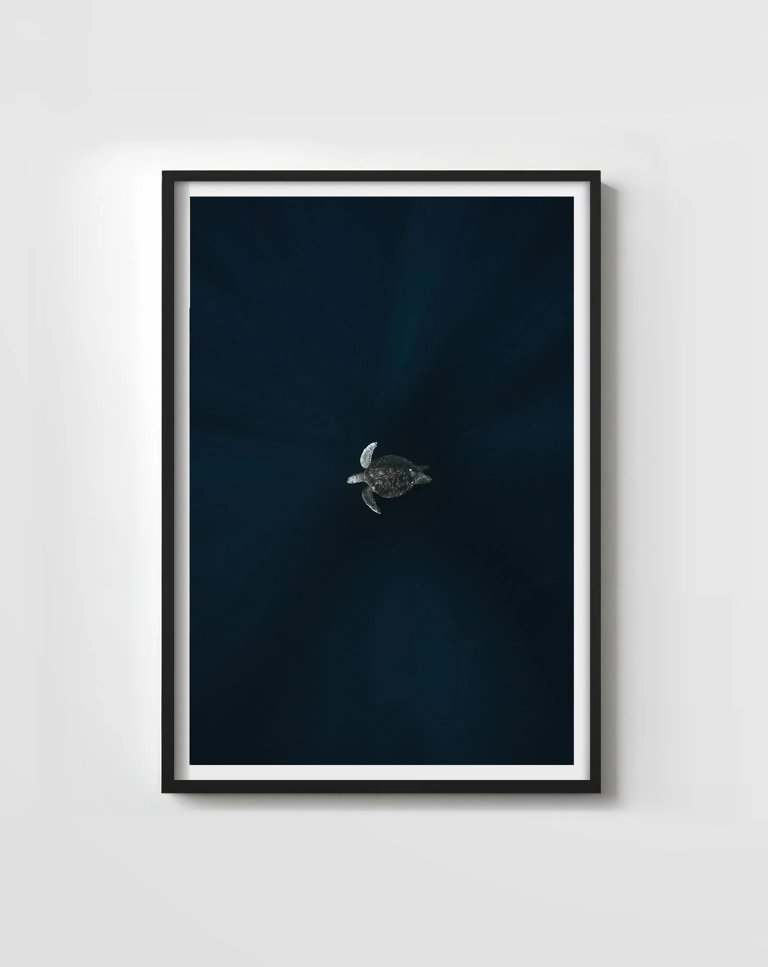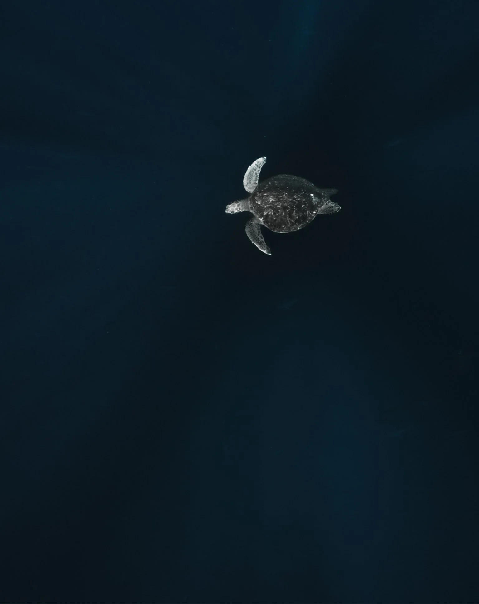 Below the gaze where blue descends to fright, A shadow moves a sea turtle's silent flight.